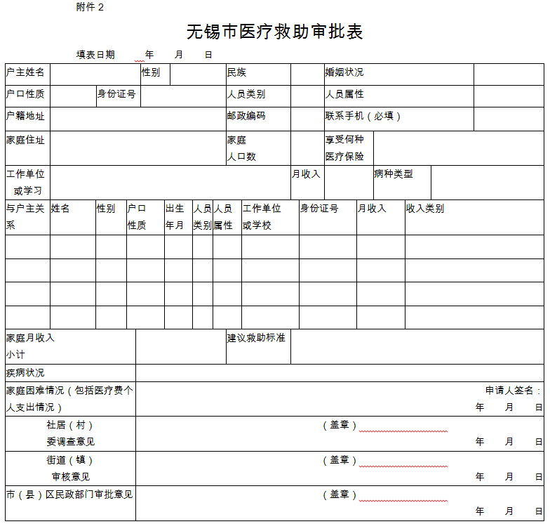 ?。ǘ┙值擂k事處(鎮(zhèn)人民政府)或者受委托的居民委員會(社區(qū)事務工作站)、村民委員會(社區(qū)服務中心)對申請人的個人疾病和家庭收入、財產狀況進行調查核實、民主評議,并在申請人所在居民委員會(社區(qū)事務工作站)、村民委員會(社區(qū)服務中心)公示7天。對無異議的,填寫《無錫市醫(yī)療救助審批表》(見附件二),上報市(縣)區(qū)民政部門審批。