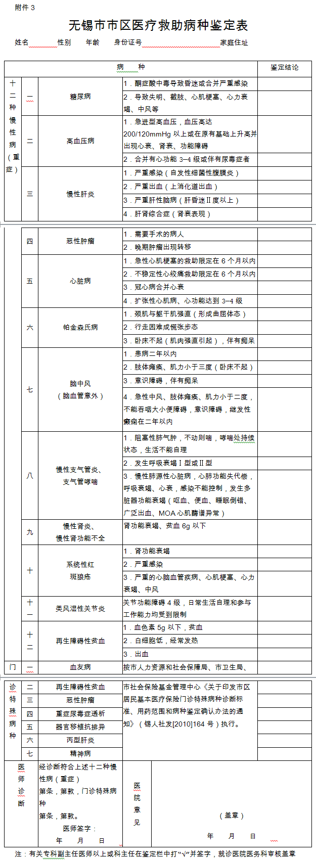 第十二條 醫(yī)療救助對象申請12種慢性?。ㄖ匕Y)或患有門診特殊病種救助標準的,須經指定醫(yī)院(市區(qū)指定醫(yī)院為:市人民醫(yī)院、市二院、市三院、市四院、市中醫(yī)院、市傳染病院、一0一醫(yī)院、精衛(wèi)中心)有關??聘敝魅吾t(yī)師以上或科主任檢查、確診,并填寫《無錫市醫(yī)療救助病種鑒定表》(見附件三);由就診醫(yī)院醫(yī)務科審核蓋章后,到戶籍所在地社區(qū)(村)提出申請,再逐級上報縣級民政部門審批。