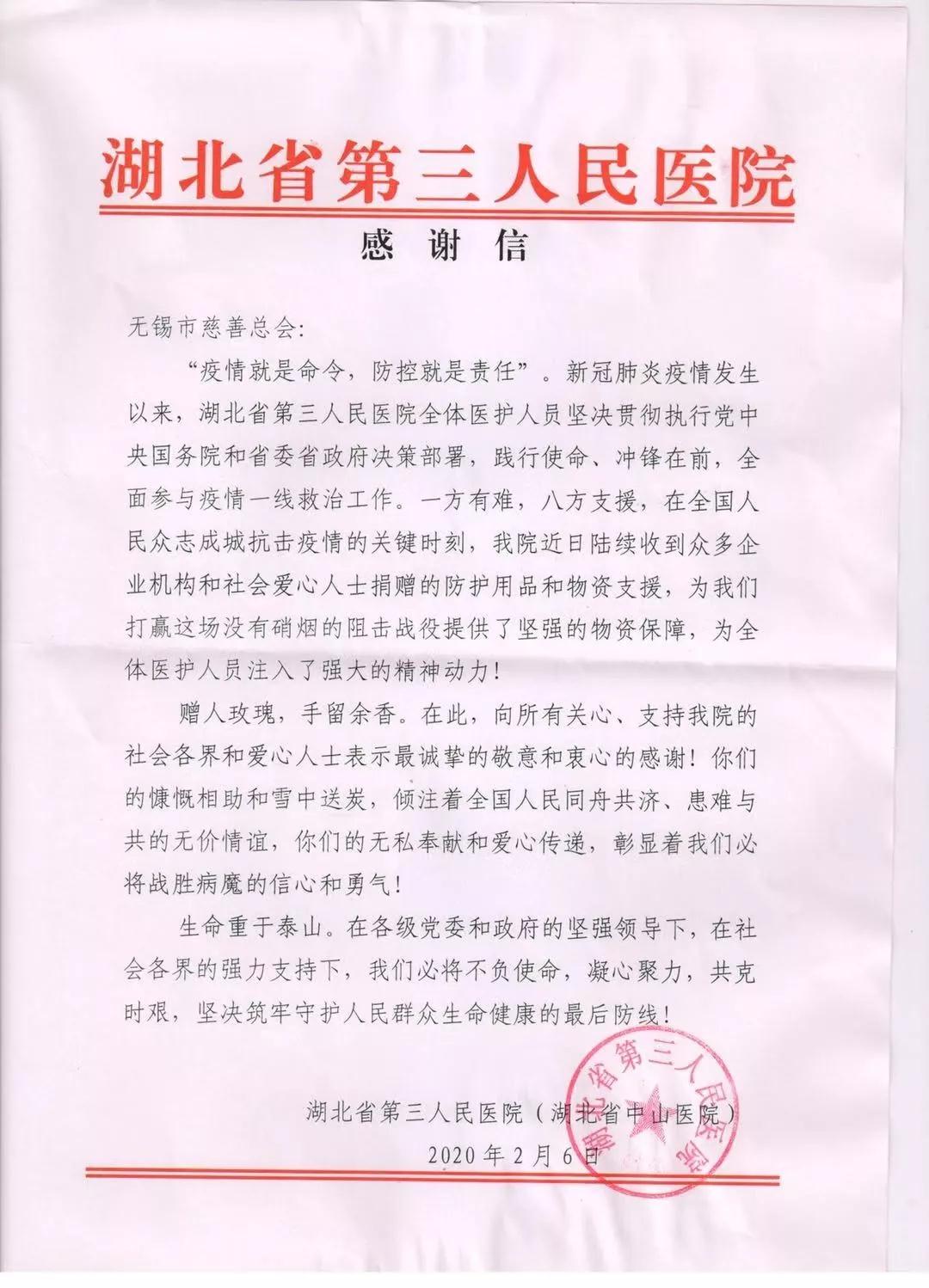 捐贈(zèng)中心全體黨員干部始終堅(jiān)守崗位,確保愛(ài)心善款及時(shí)抵達(dá)疫情防控一線。截至2月9日,市慈善總會(huì)捐助善款累計(jì)1586.56萬(wàn)元。其中,捐助我市馳援武漢一線醫(yī)護(hù)人員醫(yī)療裝備保障資金40萬(wàn)元,捐助我市疫情防控一線專(zhuān)項(xiàng)資金400萬(wàn)元,定向援助華中科技大學(xué)同濟(jì)醫(yī)學(xué)院附屬同濟(jì)醫(yī)院、協(xié)和醫(yī)院各100萬(wàn)元,捐助湖北黃岡地區(qū)650萬(wàn)元,捐助武漢市6家醫(yī)院共計(jì)190.389萬(wàn)元。收到捐助的湖北省第三人民醫(yī)院通過(guò)微信發(fā)來(lái)感謝信,表達(dá)了深切的感激之情。