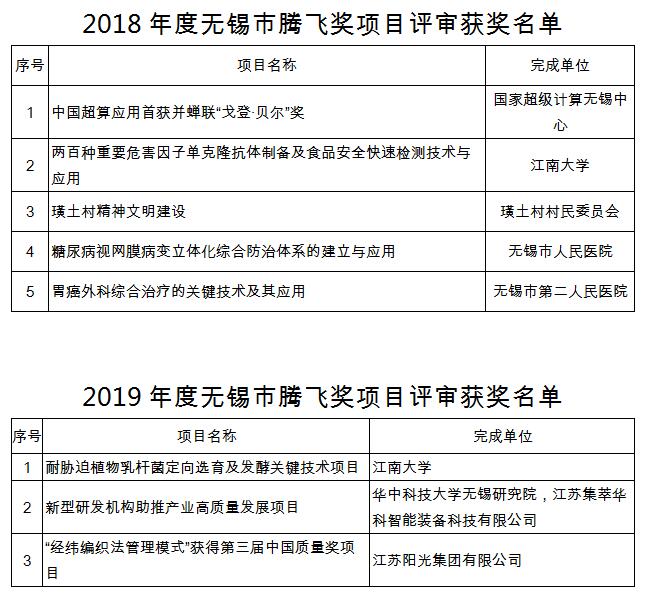 根據(jù)《市政府關于印發(fā)無錫市騰飛獎實施辦法的通知》(錫政規(guī)〔2012〕7 號)要求,經(jīng)項目受理、形式審查、項目初評、信用查詢、現(xiàn)場考察和無錫市騰飛獎評審委員會評審、項目公示等程序,市政府決定授予“中國超算應用首獲并蟬聯(lián)‘戈登·貝爾’獎”等5個項目2018 年度無錫市騰飛獎,授予“耐脅迫植物乳桿菌定向選育及發(fā)酵關鍵技術”等3個項目2019年度無錫市騰飛獎。