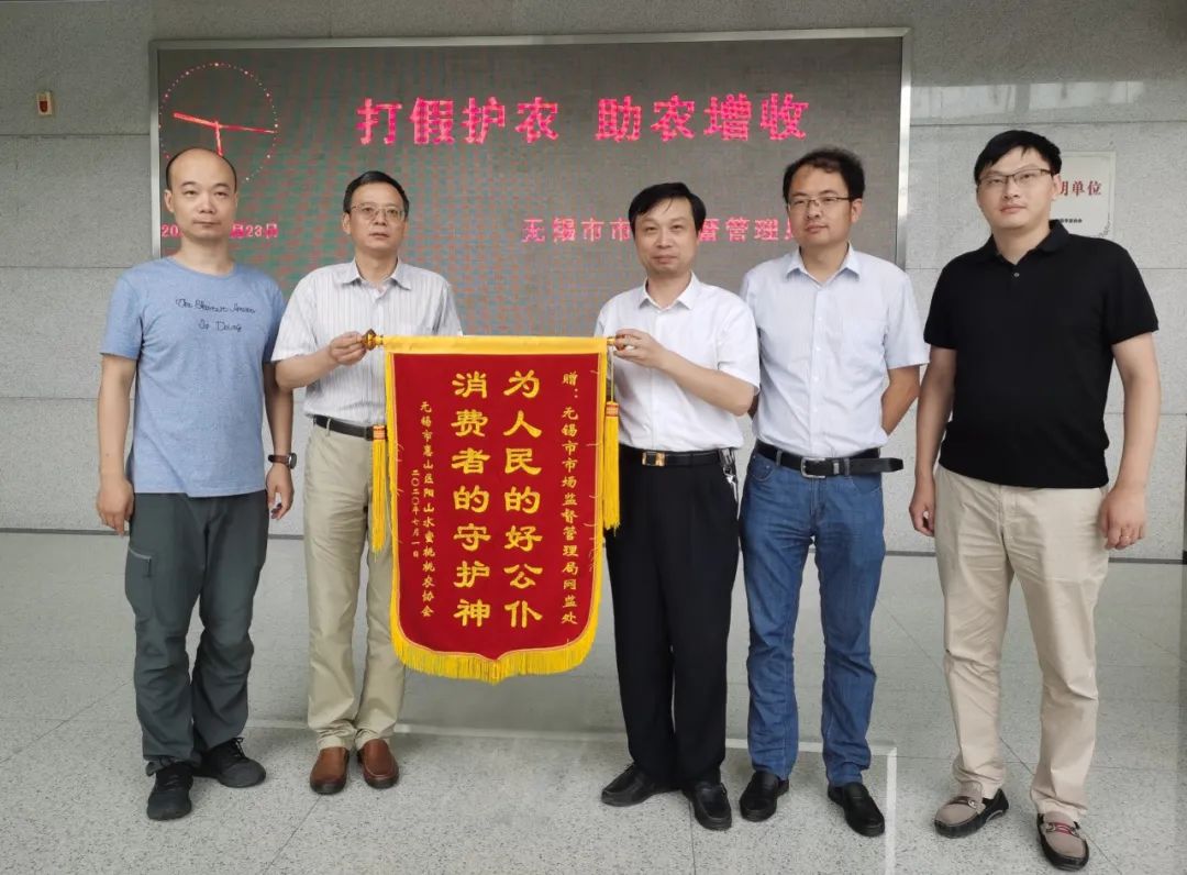 7月24日,無錫市陽山水蜜桃桃農(nóng)協(xié)會為市場監(jiān)管局網(wǎng)監(jiān)處送來錦旗,感謝市場監(jiān)管局整頓網(wǎng)絡銷售秩序、維護桃農(nóng)合法權(quán)益。