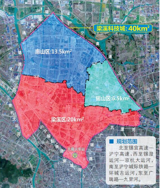 梁溪科技城規(guī)劃編制范圍位于老城區(qū)北部的三區(qū)交界之地,北至錫宜高速—滬寧高速,西至錫澄運河—京杭大運河,南至滬寧城際鐵路—環(huán)城古運河,東至廣瑞路—九里河,總面積約40平方公里。其中,梁溪區(qū)20平方公里,惠山區(qū)13.5平方公里,錫山區(qū)6.5平方公里。此次招標的內(nèi)容,不僅包括梁溪科技城概念規(guī)劃,還包括對10平方公里核心區(qū)開展概念性城市設計,并在核心區(qū)范圍內(nèi)選取1—2平方公里區(qū)域作為科技城核心啟動區(qū),開展詳細城市設計。