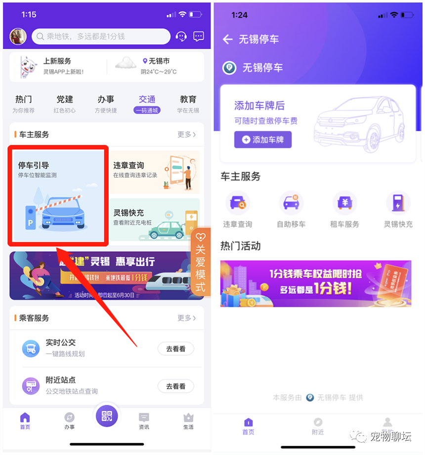第一步,點(diǎn)擊進(jìn)入“靈錫”APP首頁—【交通】版塊—【停車引導(dǎo)】功能;