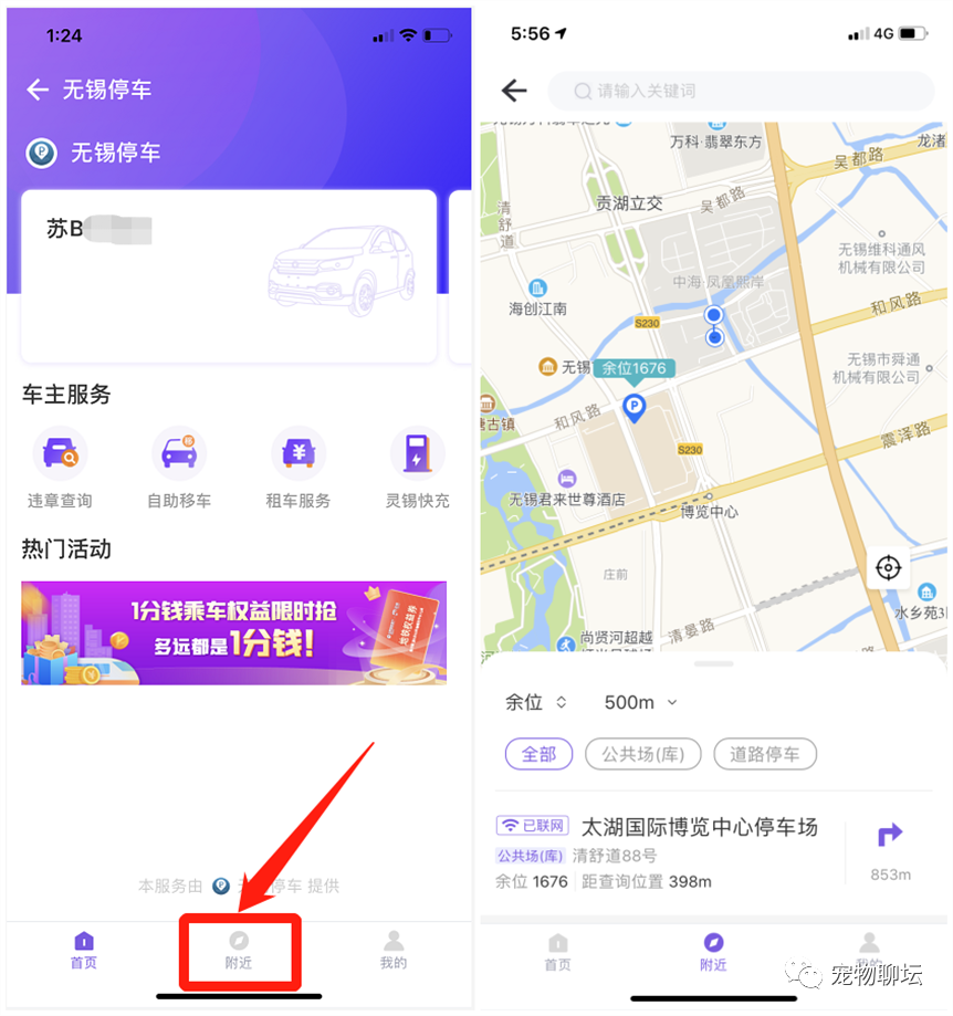 第三步:點(diǎn)擊【附近】可查看距您最近的停車場,300米、500米、1000米范圍內(nèi)的車位數(shù)量一目了然,或者您可選擇在【搜素欄】直接輸入目的地關(guān)鍵詞,查找目的地附近的停車場。