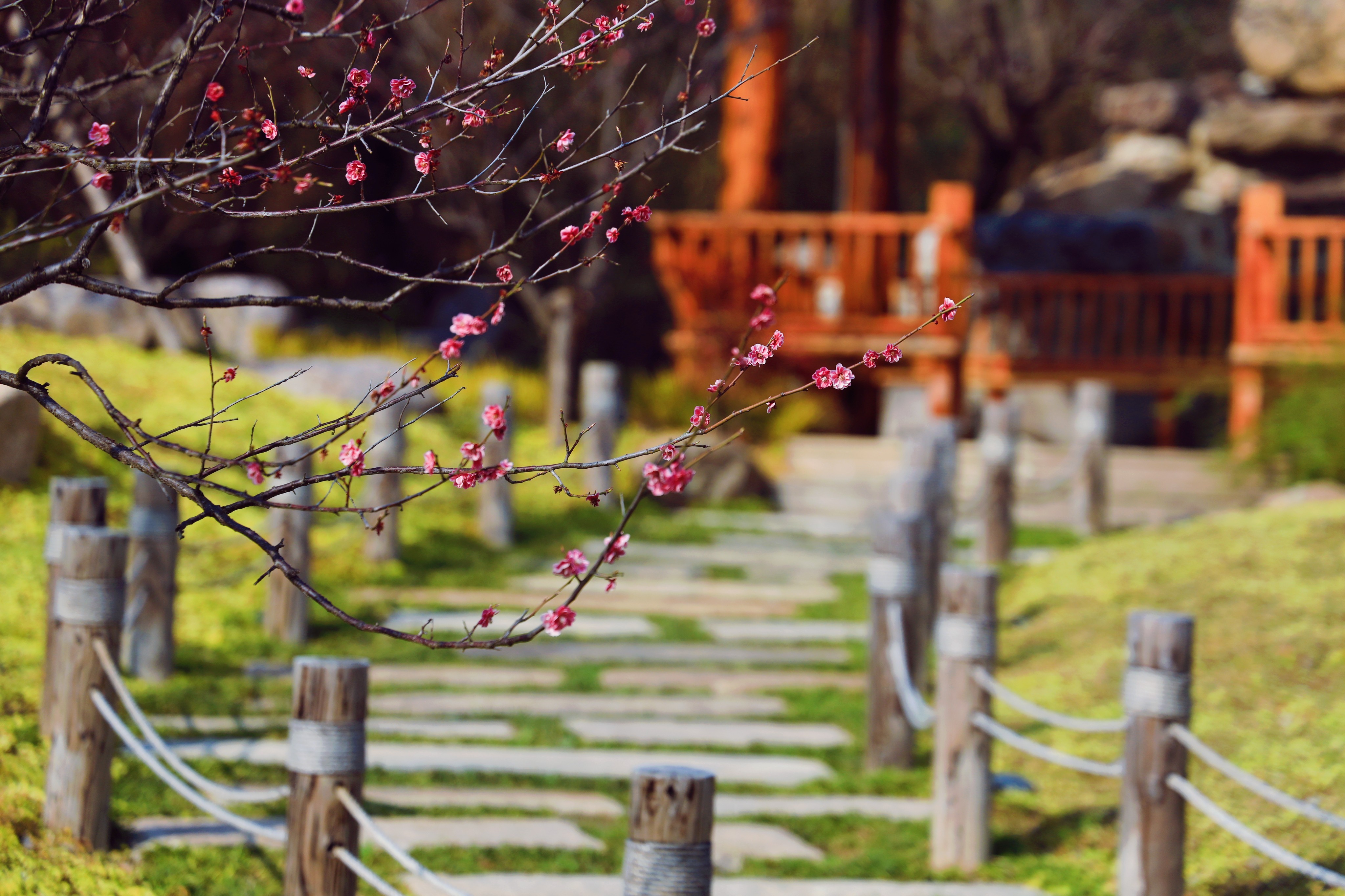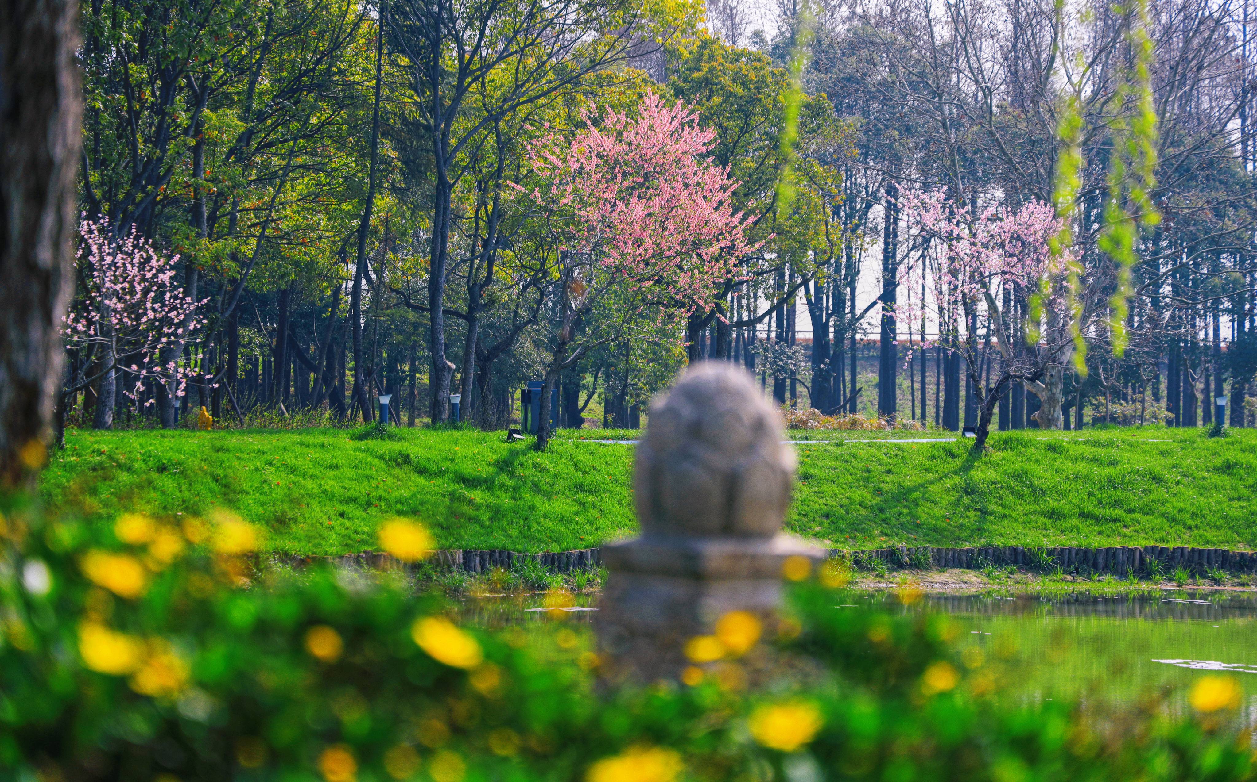 湖邊還點(diǎn)綴著桃花朵朵,“桃之夭夭,灼灼其華”,桃枝在春風(fēng)中搖曳起舞,桃花伴著舞步點(diǎn)頭含笑,不需要滿溢的堆積,這樣兩三枝、一兩朵的留白,令人更感春意浪漫。
