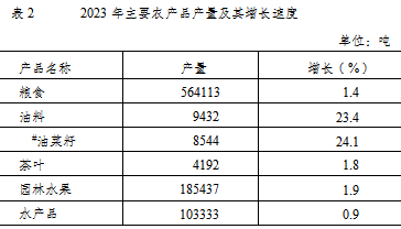 全年糧食總產(chǎn)量56.41萬(wàn)噸,比上年增長(zhǎng)1.4%。油料總產(chǎn)量9432噸,比上年增長(zhǎng)23.4%,其中油菜籽8544噸,比上年增長(zhǎng)24.1%。茶葉總產(chǎn)量4192噸,比上年增長(zhǎng)1.8%;園林水果總產(chǎn)量18.54萬(wàn)噸,比上年增長(zhǎng)1.9%。