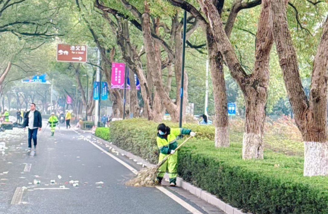 環(huán)衛(wèi)部門實行“人工駐點巡回保潔、機械設(shè)備待命跟進(jìn)”的工作機制,根據(jù)比賽情況開啟波浪式工作模式,環(huán)衛(wèi)工人清理賽道、垃圾收運車按順序清理沿途垃圾、洗掃車輛沖洗賽道,在參賽人員過境后迅速對各點位進(jìn)行保潔作業(yè),確保人清場凈。