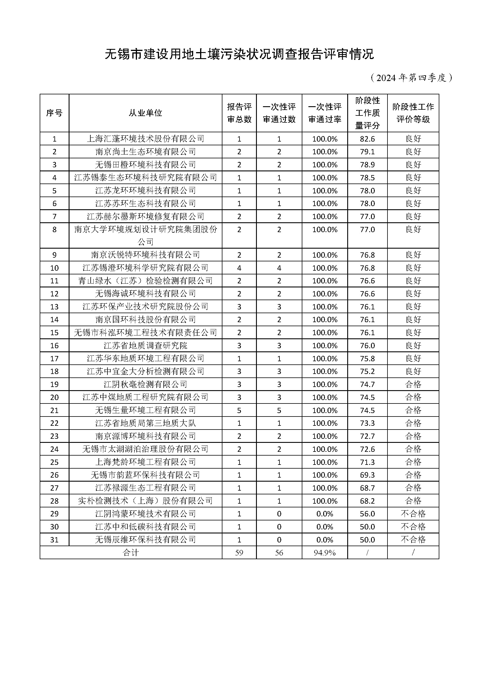 根據(jù)《無錫市建設(shè)用地土壤污染狀況調(diào)查從業(yè)單位工作質(zhì)量評價辦法(試行)》,我局對全市2024年第四季度建設(shè)用地土壤污染狀況調(diào)查報告評審情況進行了匯總,相關(guān)情況公示如下: