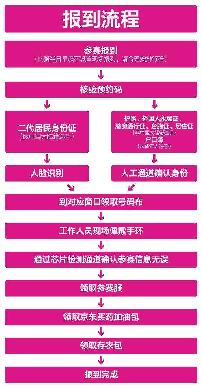 1. 中國大陸籍選手須持二代居民身份證原件;2. 中國香港、中國澳門籍選手須持港澳居民來往內地通行證或港澳居民居住證原件;3. 中國臺灣籍選手須持臺灣居民來往大陸通行證或臺灣居民居住證原件;4. 外籍選手須持護照或外國人永久居留身份證原件;5. 18周歲以下未成年選手,須由其監(jiān)護人或者法定代理人持監(jiān)護人證件原件、身份證或戶口簿原件,攜選手本人辦理報到手續(xù)。*請確保所持證件在有效期內,并與報名填報信息一致。無上述證件原件者,將拒絕為其發(fā)放參賽物品。