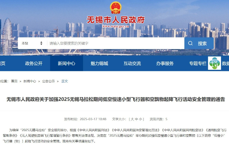 無錫市人民政府關(guān)于加強(qiáng)2025無錫馬拉松期間低空慢速小型飛行器和空飄物起降飛行活動安全管理的通告