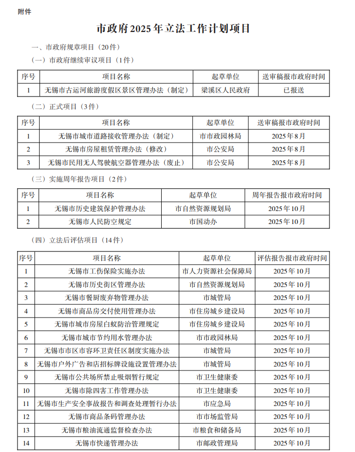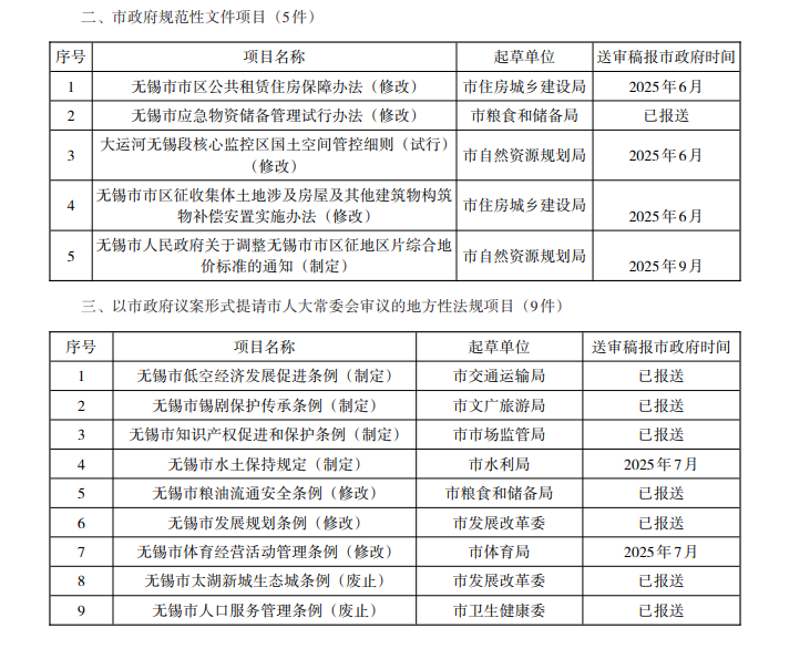 無錫市人民政府 2025 年立法工作計劃